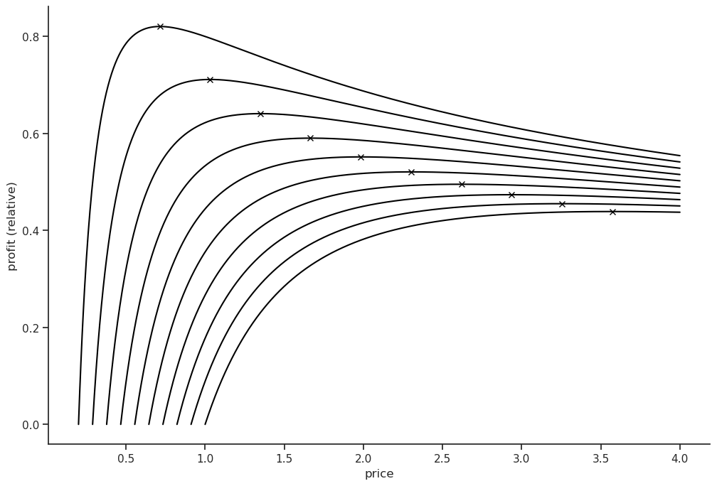 The optimal price can be found using the criterion \(\partial{\text{Profit}}=0\)